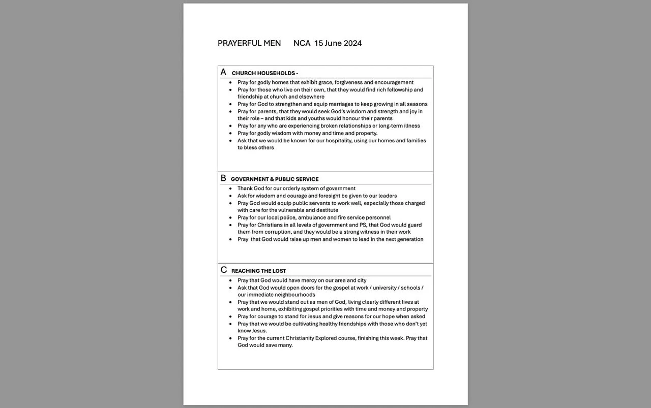 Group Praying - Men’s Afternoon: Prayer Training 15 June Written By James Macbeth In our third session we split into groups to pray. The outline we used can be downloaded below: Men's Afternoon 2024 James Macbeth